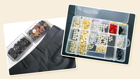 ズボンの後ろポケットなどのボタンがはずれている場合は、受付時にお客様の了承をいただき、似たようなボタンの取り付けをさせていただいてます。